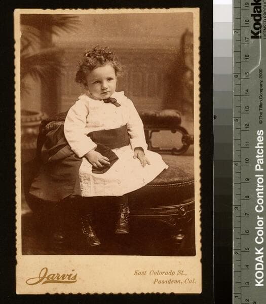 A bust-length studio portrait of Norbert Newlands Shorb as a toddler, with his body turned slightly to the left and his head turned very slightly to the right. He has dark eyes and slightly wild pale hair, and is wearing a white shirt or dress with a high collar.