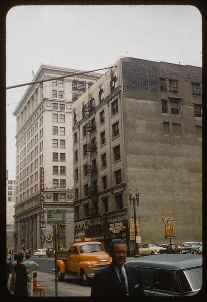 6th Street and Spring Street, Los Angeles. Grosse Building soon to be wrecked for a new skyscraper