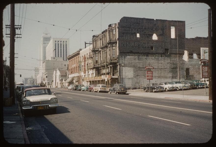 Entire north side block of 6th Street between Hope and Flower Streets to be demolished. Background building is the California Club, 538 South Flower Street.