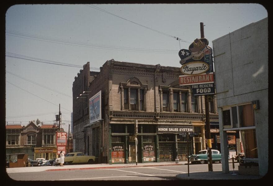Sentous Block building at 616-620 North Spring Street as seen from the Macy Street intersection, Los Angeles. Hotel Atlantic, Hotel Pacific, and part of Pico House lie to the right in background. Car in the foreground is a 1957 De Soto Fireflite Sportsman.