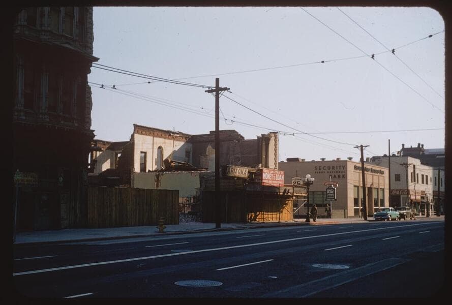 Main Street at 101 freeway. Grand Central Hotel being wrecked
