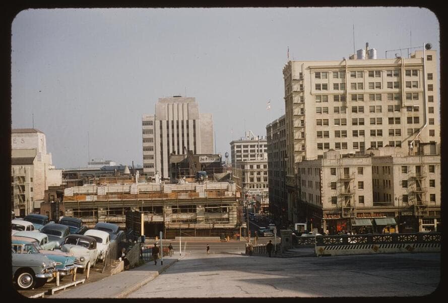 Northeast corner of 2nd Street and Hill Street, Los Angeles, fenced off for demolition of the Fashion League Building (formerly the Union League Building).