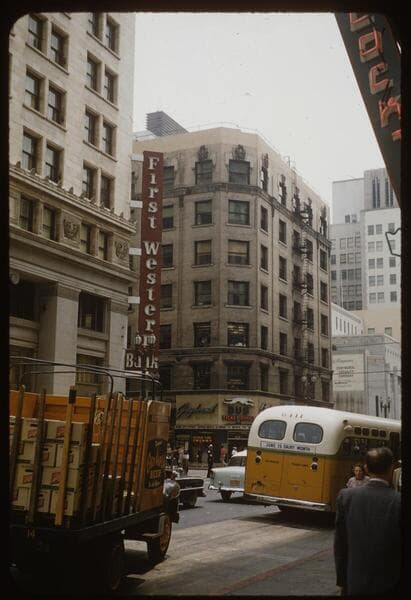 6th Street and Spring Street, Los Angeles. Grosse Building soon to be wrecked for a new skyscraper