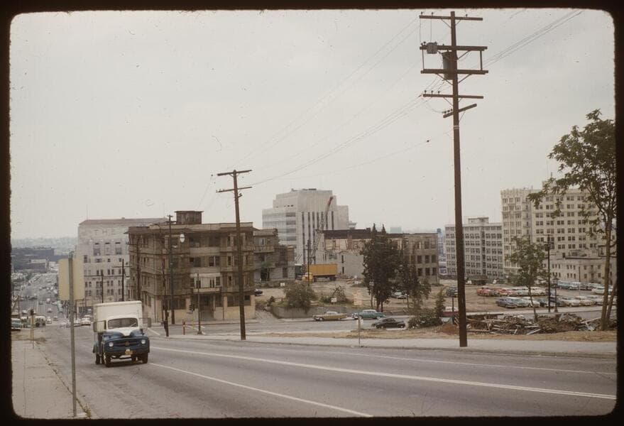 Gladden Hotel, 100 South Olive Street, at left. Crane is demolishing the El Moro Hotel, 109 South Hill Street, and Moore Cliff Hotel, 121 South Hill Street.
