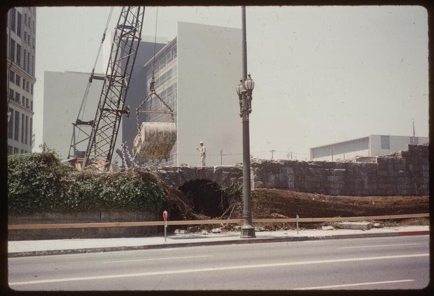 Southwest corner of Hill and 1st Streets. Leveling the ground once occupied by the Moore Cliff Hotel and other structures and demolishing the Hill Street side retaining wall in the process.