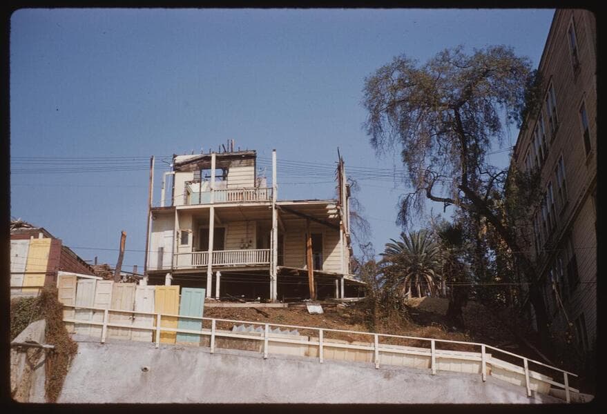 This collection consists of 35mm Kodachrome slides taken between 1954 and 1972. This collection of photographs taken by amateur photographer Palmer Conner documents by street the physical and social changes of Bunker Hill during the earliest stages of redevelopment. The collection is particularly strong in its depiction of the Bunker Hill neighborhood of downtown Los Angeles during redevelopment in the 1950s. Images chiefly consist of views of commercial and residential building exteriors taken from the street, including images of both new construction and older buildings in the process of being demolished.