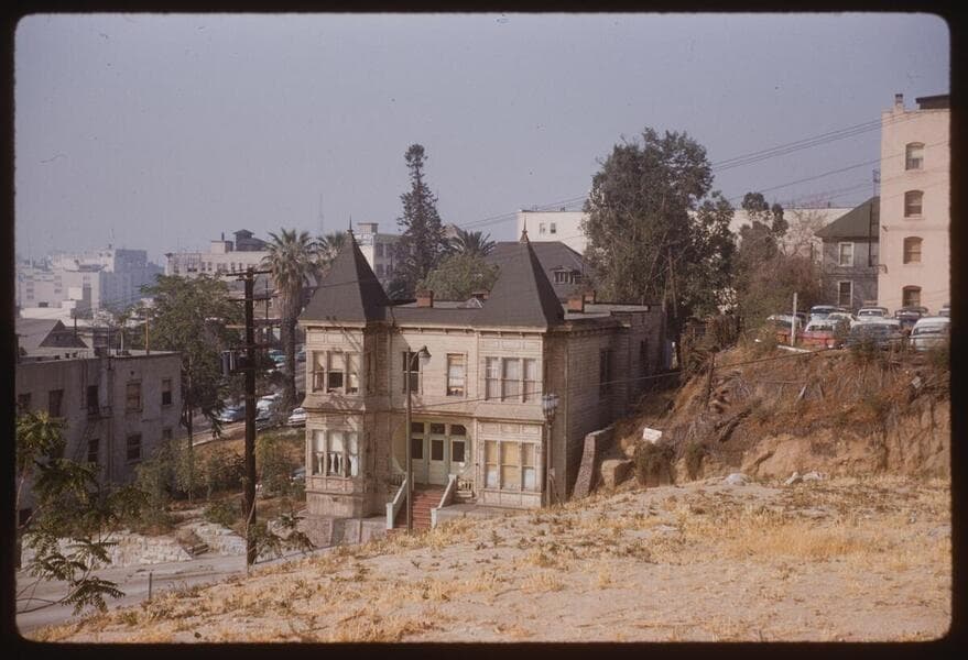 Second Empire style Victorian home with mansard roof and dormer windows. It occupied the south side of Temple Street at the north limit of Bunker Hill. Lower right foreground is actually a storefront with a Barr Realty sign affixed.