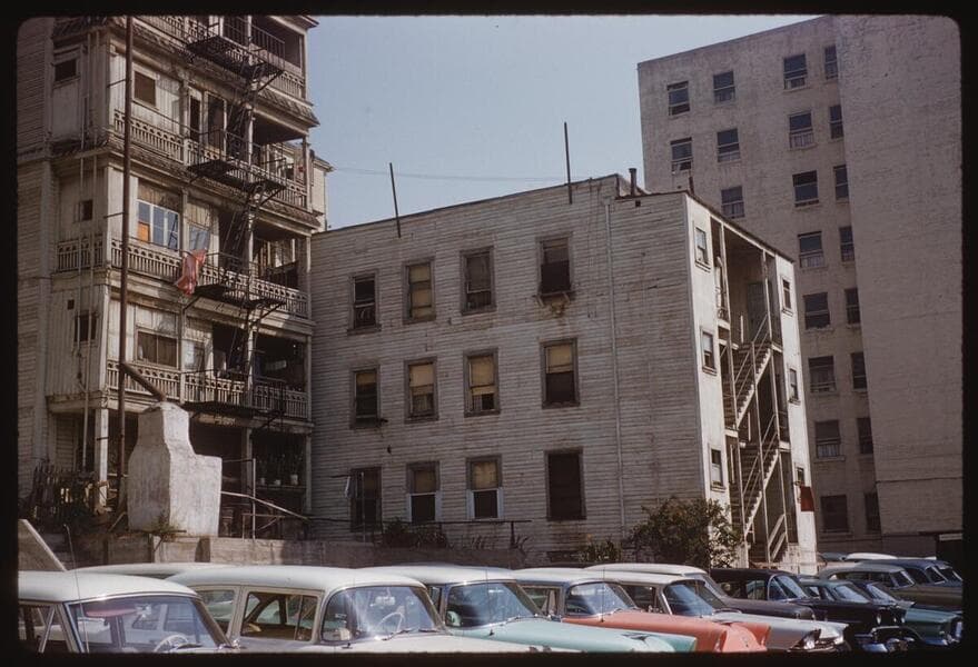 Row of four Victorian structures at 322-334 South Olive Street. In the shadowed left background is the Broadway department store and the Black Building, 357-361 South Hill Street. Visible in the far background, Hotel Clark sign is at 426 Hill Street and the tower of the Title Guarantee Building at 411 5th Street. On the sidewalk next to the cleared area is a Danger Keep Out sign and a barricade with light. 1961 Plymouth Suburban station wagon coming up the hill.