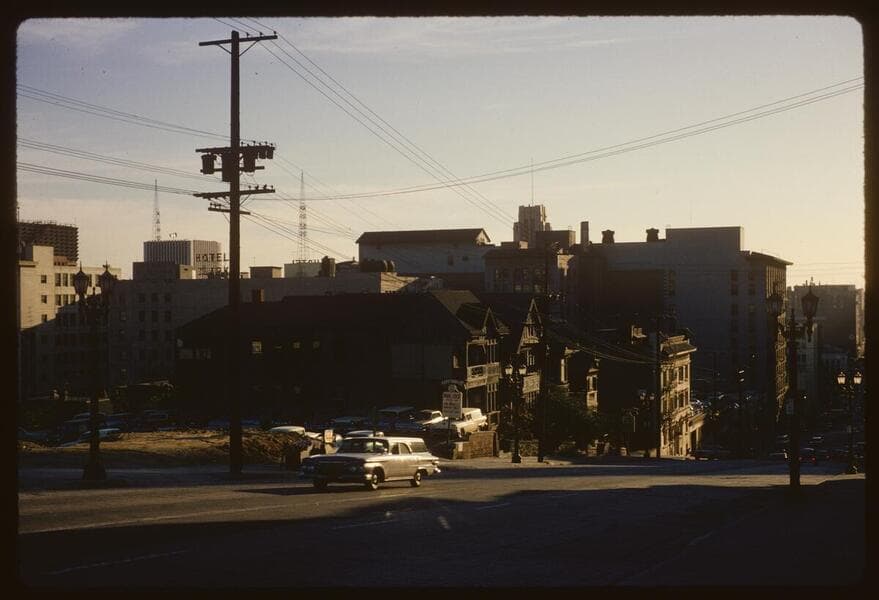 Rear view of structures and cars from Clay Street. The left building is 224 South Olive Street. On the far right, the Hotel Northern sat at the southwest corner of Hill Street and Clay Street.