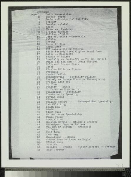 85 album pages, each containing an 8 x 10-inch photograph depicting sets, performers, and concepts from live variety stage shows performed before feature films. These shows, known as "Ideas," were produced by the Los Angeles-based theatrical production team of Fanchon and Marco. The photographs document stages, often with ornate set designs, rehearsals, dance and musical numbers, costumes, and group and single portraits of dancers, musicians, and actors for shows performed from around 1931. Photographers chiefly unidentified; a photographs for "Ted Lewis" include the imprint of the White Studio of New York (page 66). The photographs were originally housed in a custom binder and comprise volume 9 of a 16-volume set that served as a visual inventory for hundreds of Fanchon & Marco performances.
