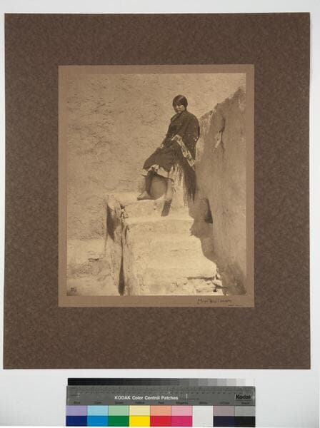 A Hopi woman holding a baby and seated at the edge of a mesa with another child.