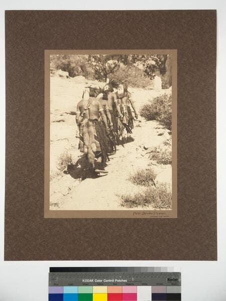 Hopi men in ceremonial dress and body paint performing a Snake Dance.