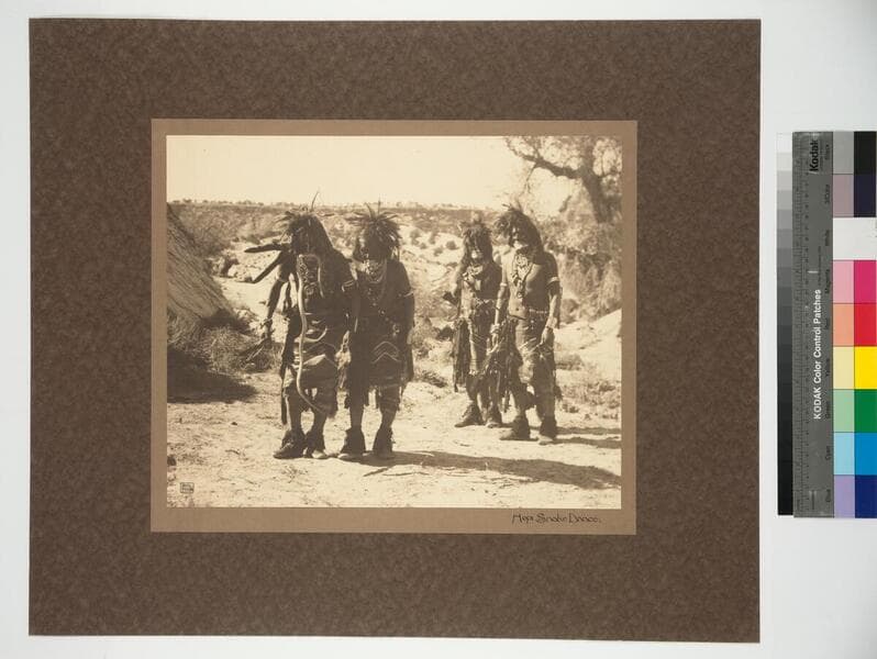 Hopi men in ceremonial dress and body paint performing a Snake Dance.