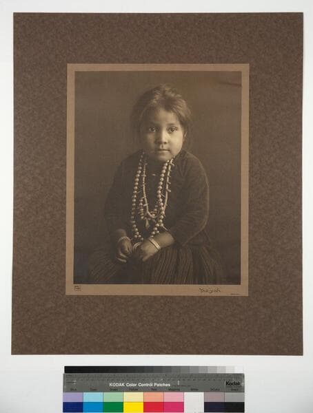 Studio portrait of a young Navajo girl with beaded jewelry.