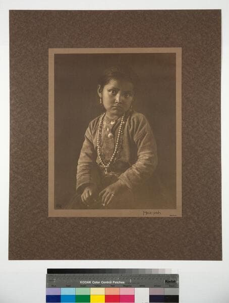 Studio portrait of a young Navajo girl with beaded jewelry.