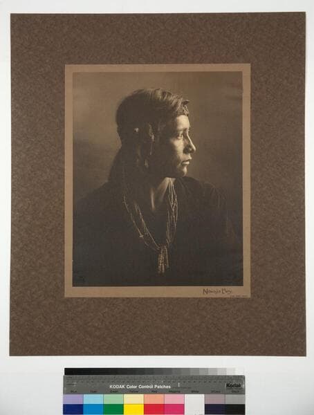 Studio portrait of a Navajo man with beaded necklace and hoop earrings.