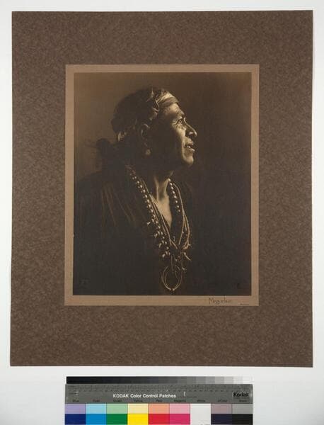 Studio portrait of a Navajo medicine man wearing an ornate necklace.