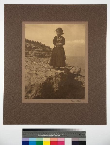 Studio portrait of a young Navajo girl with beaded jewelry.