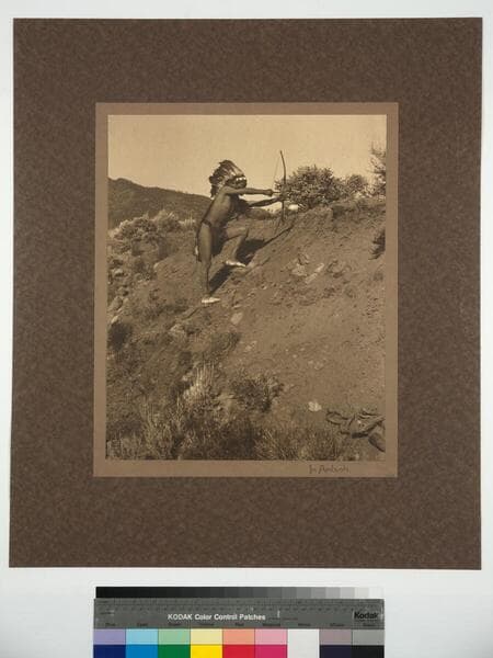 A man posed holding an arrow, with a beaded bag, blanket and pottery vessel nearby.
