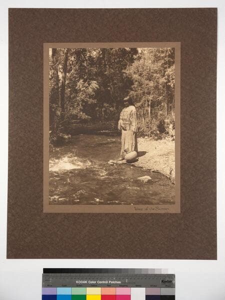 A Hopi woman with large pottery vessel, standing next to a pool of water.