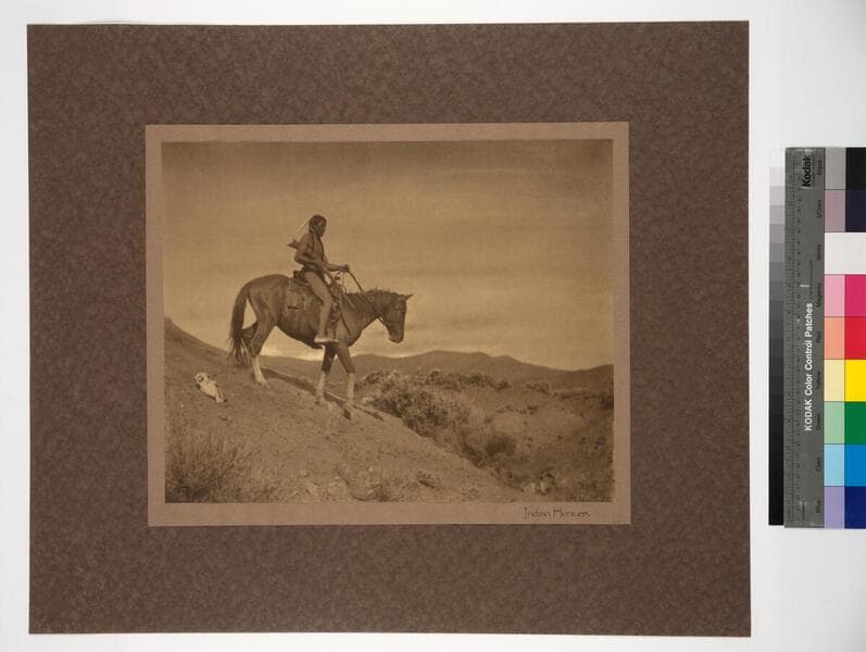 A Pueblo Indian man riding on horseback, carrying a rifle. An animal skull with horns is on the ground.