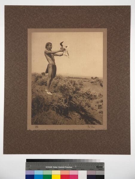 Portrait of a Pueblo Indian man with fur pieces in his hair and wearing a buckskin top.