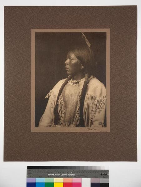 Studio portrait of a Pueblo Indian man wearing a buckskin top.