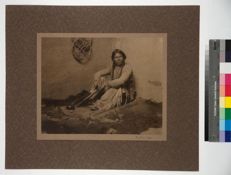 An older Pueblo Indian man sitting in front of a fire holding a peace pipe. A young man and small boy are sitting beside him.