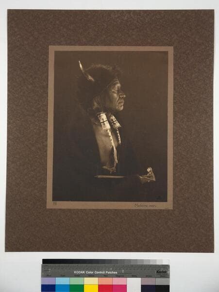 Studio portrait of a Pueblo Indian man wearing a buckskin top.