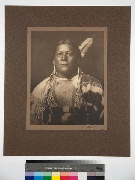 Portrait of a Pueblo Indian man wearing a buckskin top and feathers in his hair.
