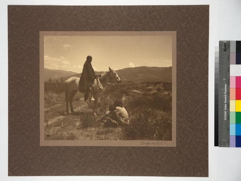 A Pueblo Indian man riding on horseback, carrying a rifle. An animal skull with horns is on the ground.