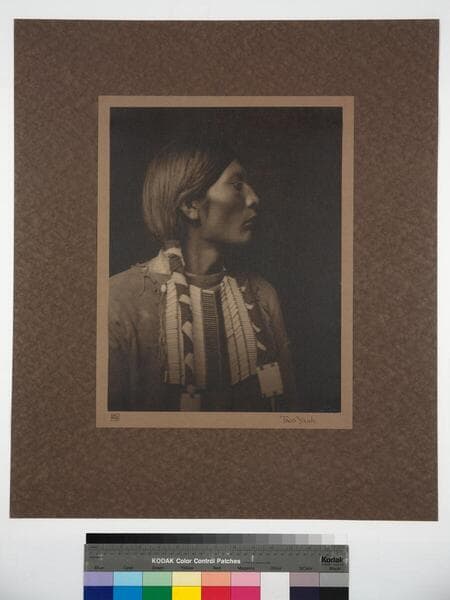 Portrait of a Pueblo Indian man with fur pieces in his hair and wearing a buckskin top.