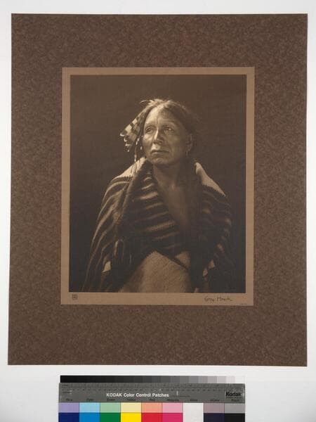 Portrait of a man wearing a buckskin top, blanket over his shoulder, and a feather in his hair.