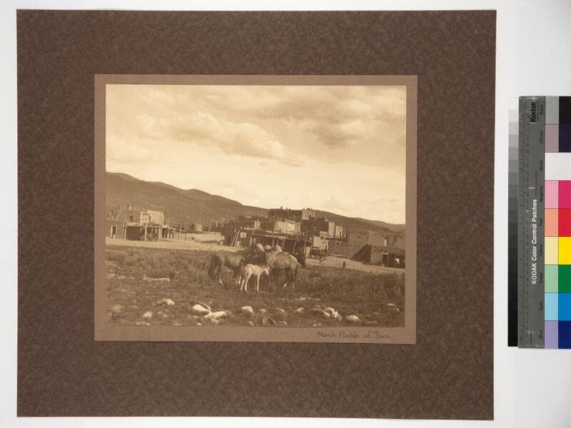 View of pueblo with hornos in front of dwellings and a wall in the foreground.
