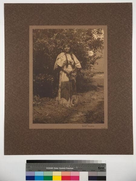 Pueblo Indian girl wearing a buckskin dress and foliage in her hair and holding more foliage in a bowl in front of her.