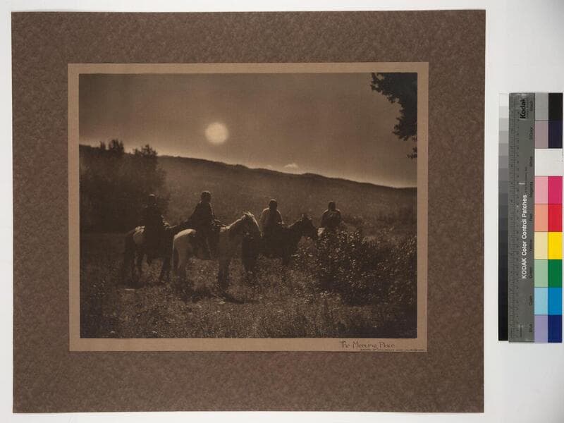 Men racing through the desert on horseback with spectators on horseback in the background.