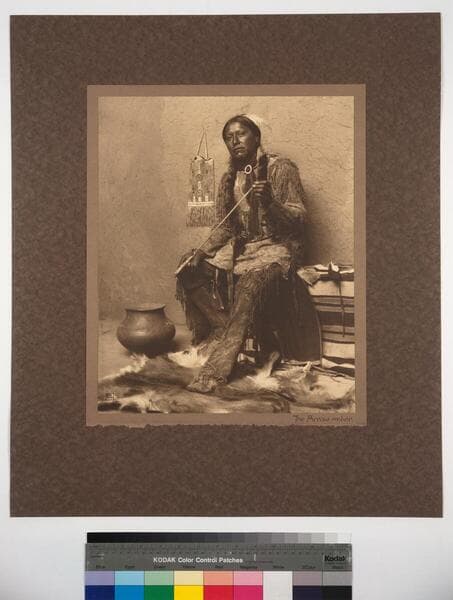 A man with a feather in his hair and laying on an animal pelt with a pottery vessel nearby.