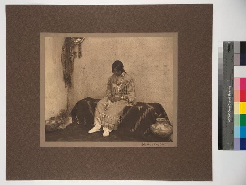 A man posed holding an arrow, with a beaded bag, blanket and pottery vessel nearby.