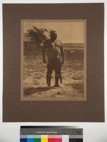 Portrait of an older man with a scarf around his neck and holding a feather fan.