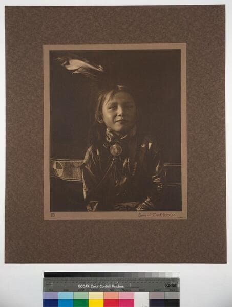 Portrait of a boy wearing a buckskin top and a feather in his hair.