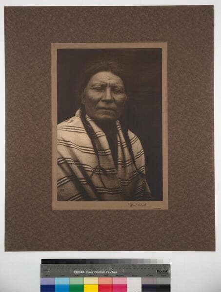 Portrait of a man with a blanket around his shoulders and a feather in his hair.