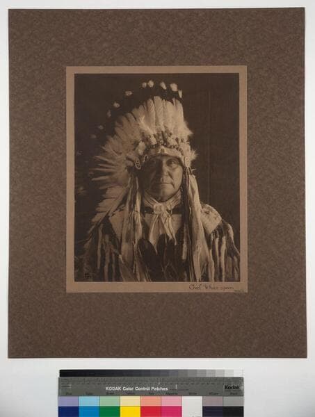 Portrait of a Pueblo Indian man wearing a buckskin top and feathers in his hair.