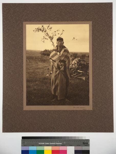 Portrait of a woman with braided hair and wrapped in a blanket.