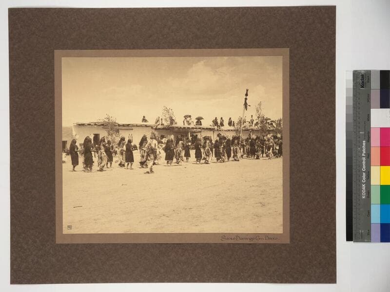 Pueblo Indians in ceremonial dress performing a Corn Dance with spectators watching from porches and rooftops.