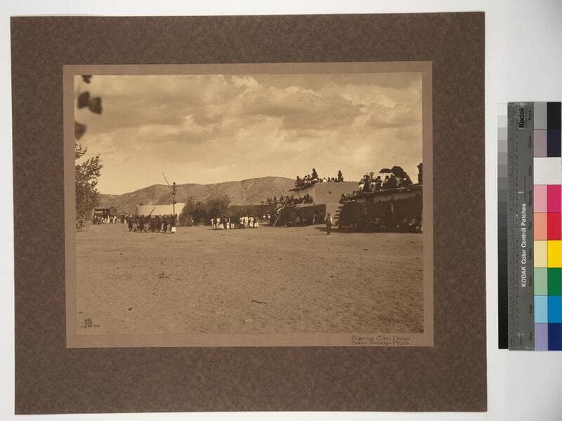 Pueblo Indians in ceremonial dress performing a Corn Dance with spectators watching from porches and rooftops.