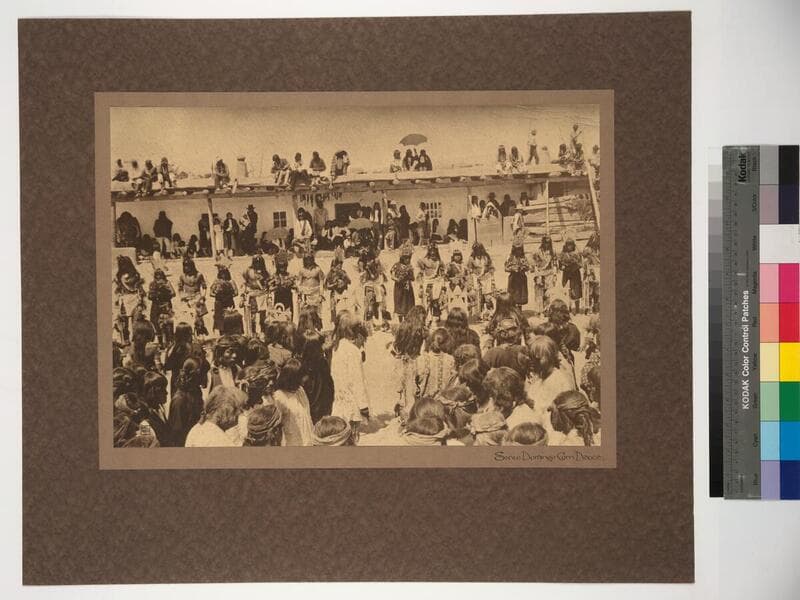 Pueblo Indians in ceremonial dress performing a Corn Dance with spectators watching from porches and rooftops.