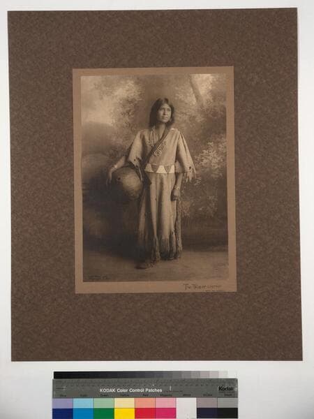 Pueblo Indian girl wearing a buckskin dress and holding a bunch of flowers.