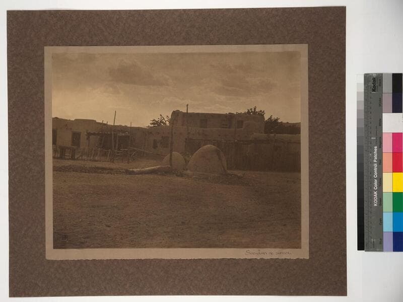 View of a pueblo with a burro standing beside two hornos in the foreground.