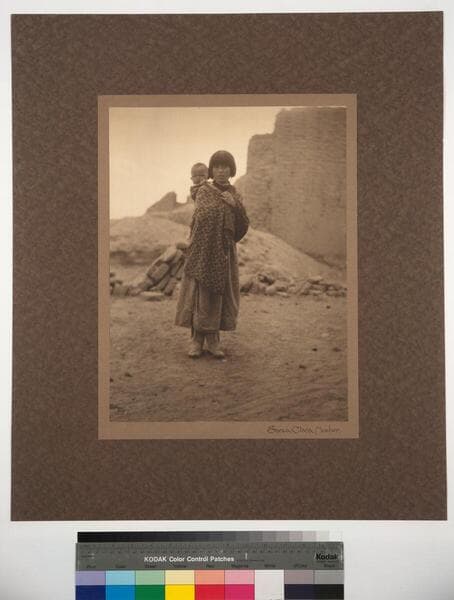 Studio portrait of a Navajo woman and a baby in a cradle-board. The woman has a blanket around her.