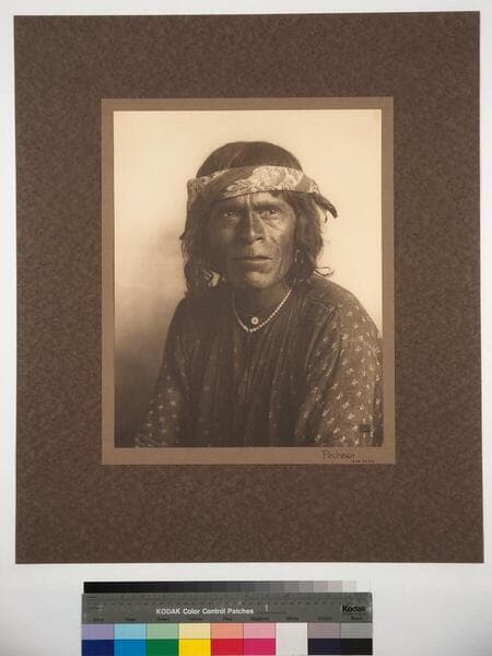 Studio portrait of a Navajo man wearing bandana and ornate necklace.